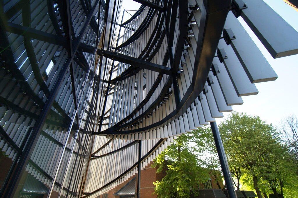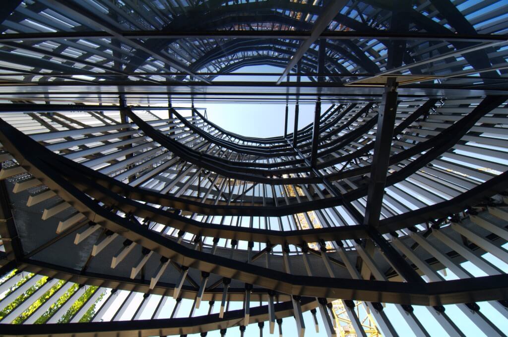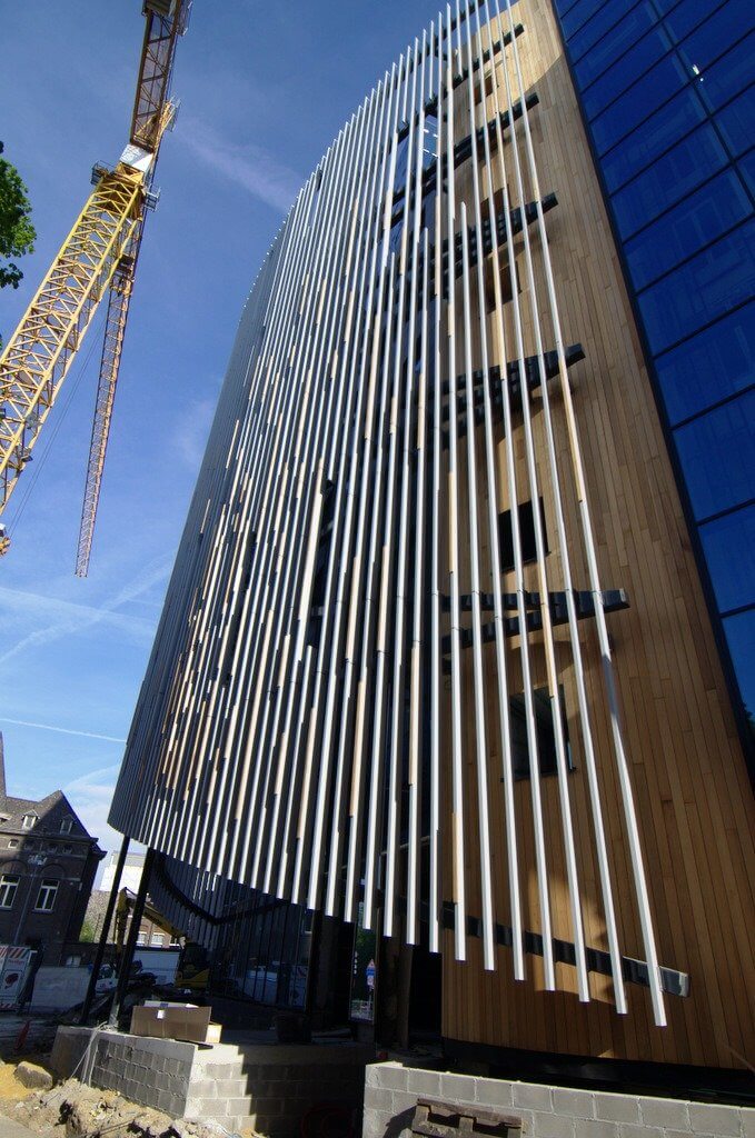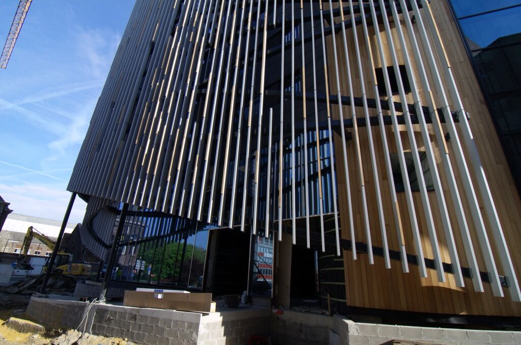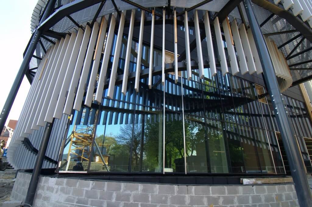 Après un début d’année marqué par la fin du montage de la structure portante de la rotonde, les ventelles en aluminium, avec appliques bois habillant celles-ci, ont été posées.